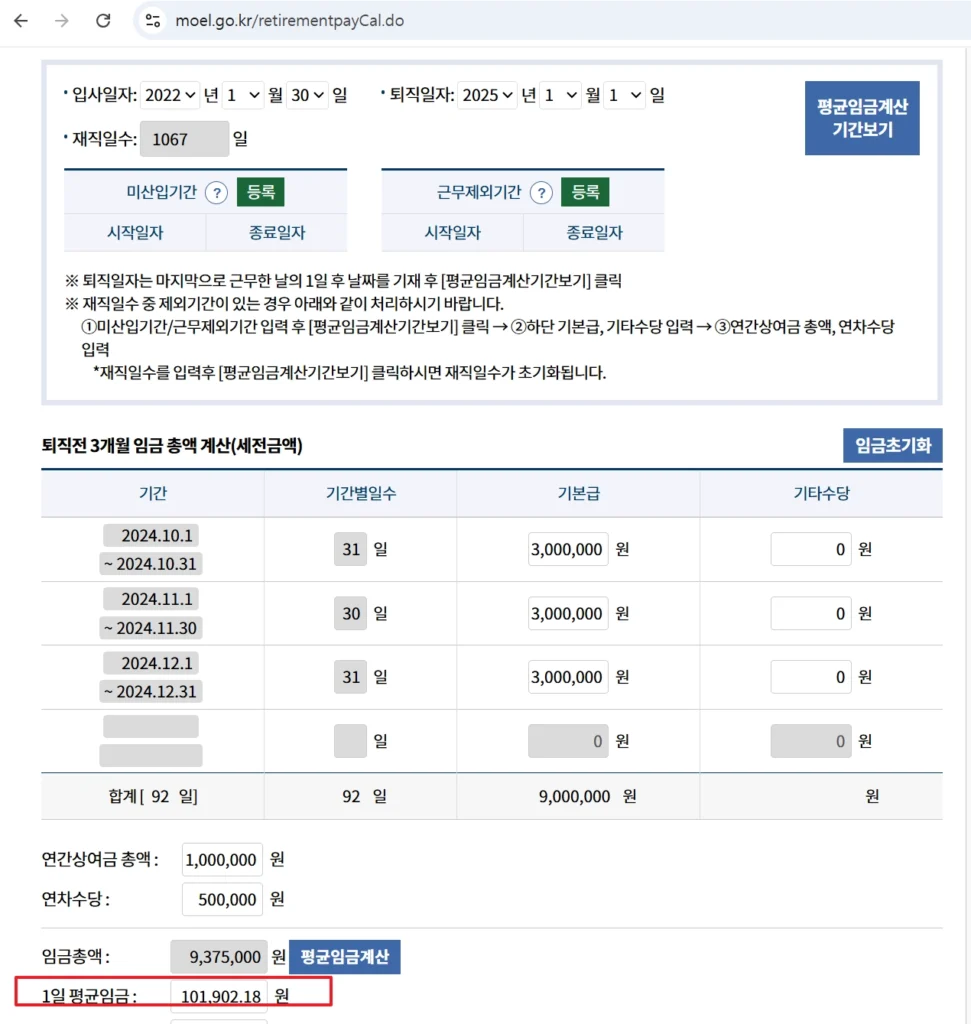 예를 들어 최근 3개월 기본급이 각각 300만 원이라면, 3개월 임금 총액을 해당 기간의 총 일수인 92일로 나누어 1일 평균임금을 산출하는 방식입니다.