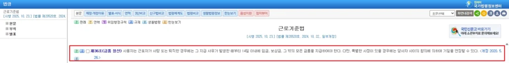 ▲ 근로기준법 제36조에 명시된 퇴직 후 14일 이내 금품 지급 의무 규정 캡쳐